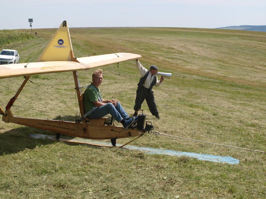 Een enorme rubber kabel werd door een groep mensen in het dal aangetrokken, en bij het zweefvliegtuig aan een haak vastgemaakt met een ijzeren ring.